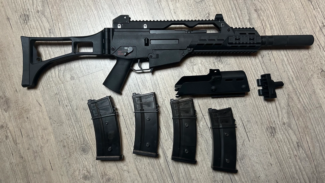 -G36 GBBR Army armament, jamais vu le terrain, garde main RIS et celui d’origine fourni, tube pour passer en crosse M4 fourni, 4 chargeurs GBBR: 150€