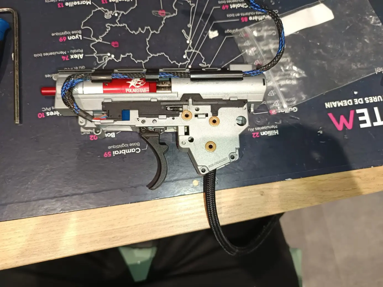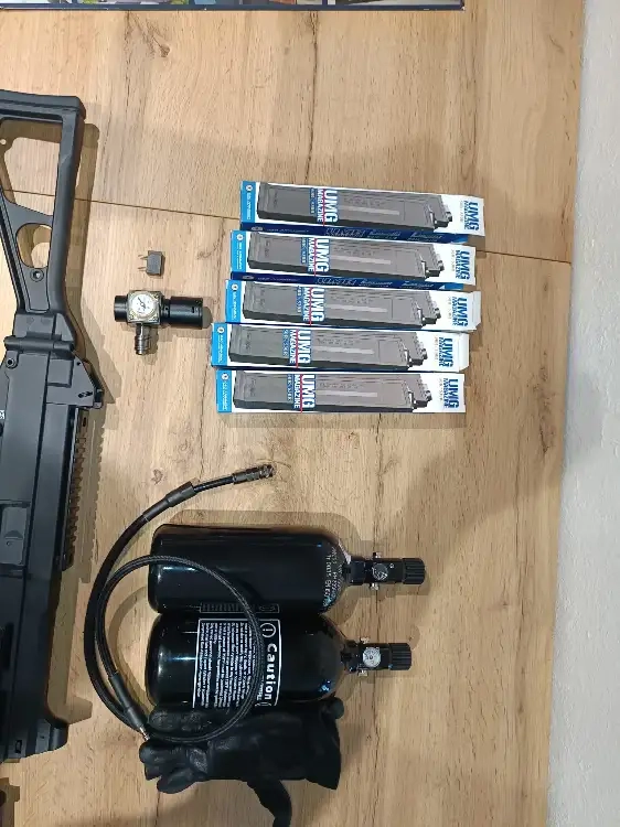Nous avons donc: un UMG g&g monté en polarstar F2, fourni avec : cinq chargeurs 50 coups + son hi cap d'origine, deux bouteilles HPA récentes (reste 7 ans à l'une 8 ans à l'autre) en alu sans fuites, avec bouchons de protections, joints supplémentaires, un régulateur balystik allant jusquà 160 PSI, flexible US, deux batteries HPA, le câble de recharge dédié, le silencieux spécifique umg g&g, la saccoche valken pour la bouteille hpa (se fixe sur passants molle) le tout fonctionnant nickel, une vidéo sera possible, des photos supplémentaires également, l'entretien de la gb a été fait par un pro suite à un montage y'a quelques mois, fonctionne nickel.