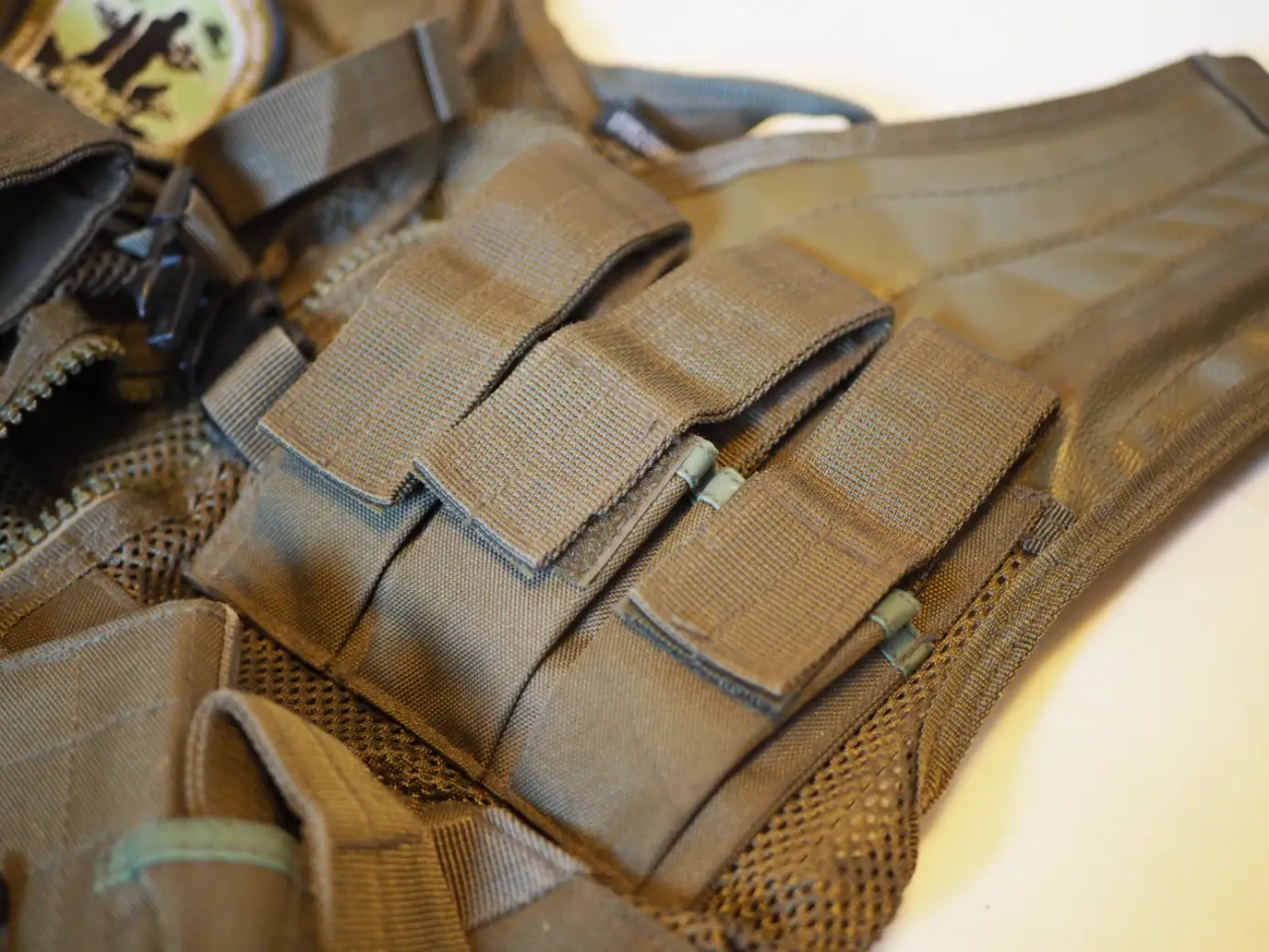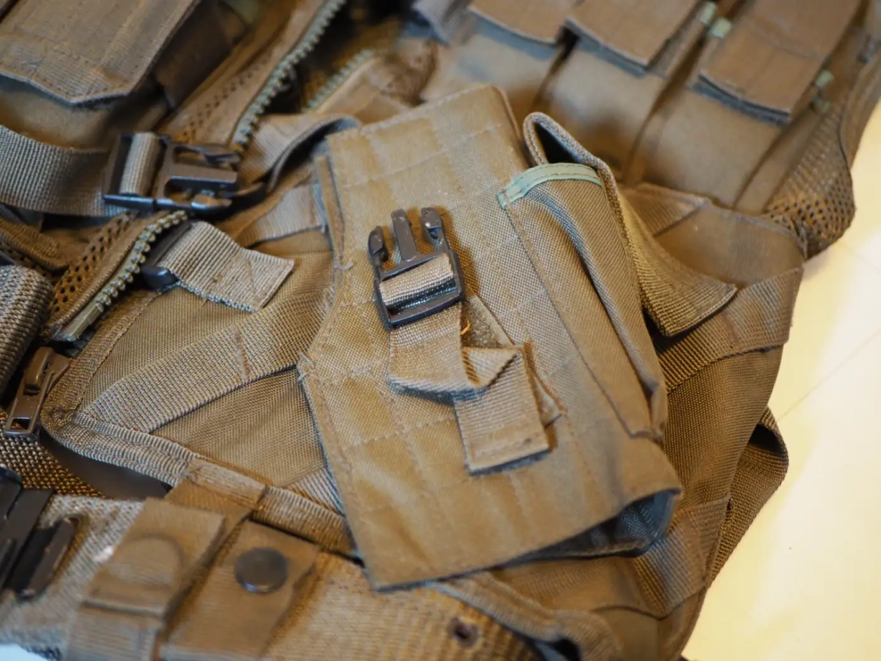 3 poches chargeur réplique longue, 3 poches réplique PA, et un holster sur le gilet.