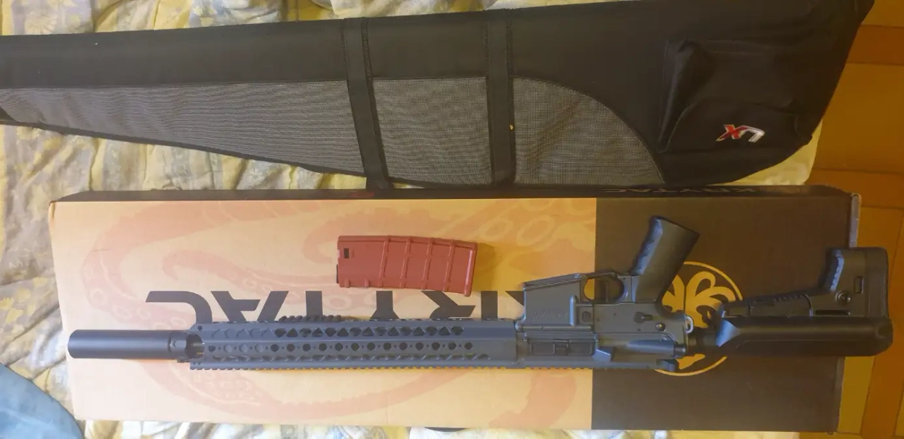 Vend une réplique AEG krytac LVOA-C de couleur combat grey peut utiliser a fait quelques parties deux petites parties limé a l'avant pour rentrer un Silencieux type RC2 SOCOM 556 Noir 14mm CCW 5KU avec sa Rallonge canon externe 2" 14mm CCW Next Generation Tokyo Marui Laylax vendu d'origine avec sa boîte et tous c'est accesoire plus housse et poignée verticale sur demande.