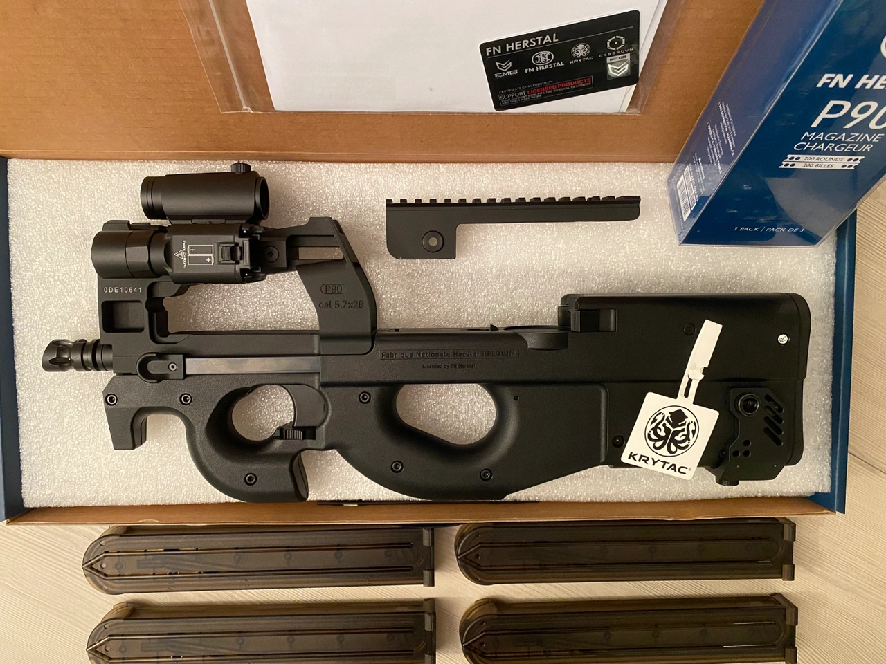Lot complet P90 Krytac absolument neuf, n’a jamais vu le terrain, uniquement quelques tirs pour vérifier son bon fonctionnement.