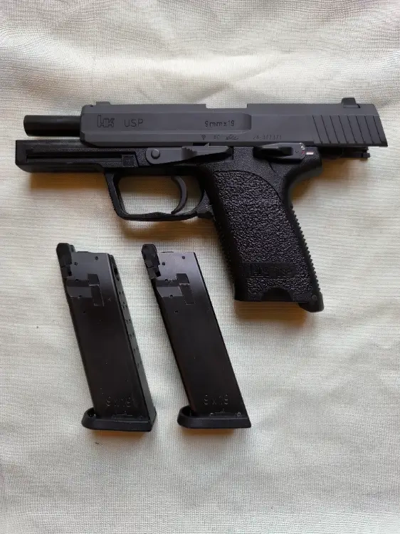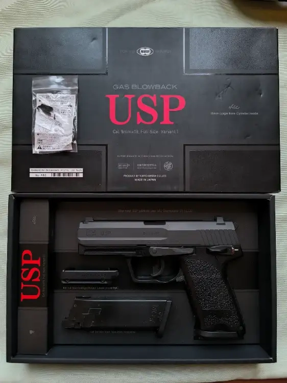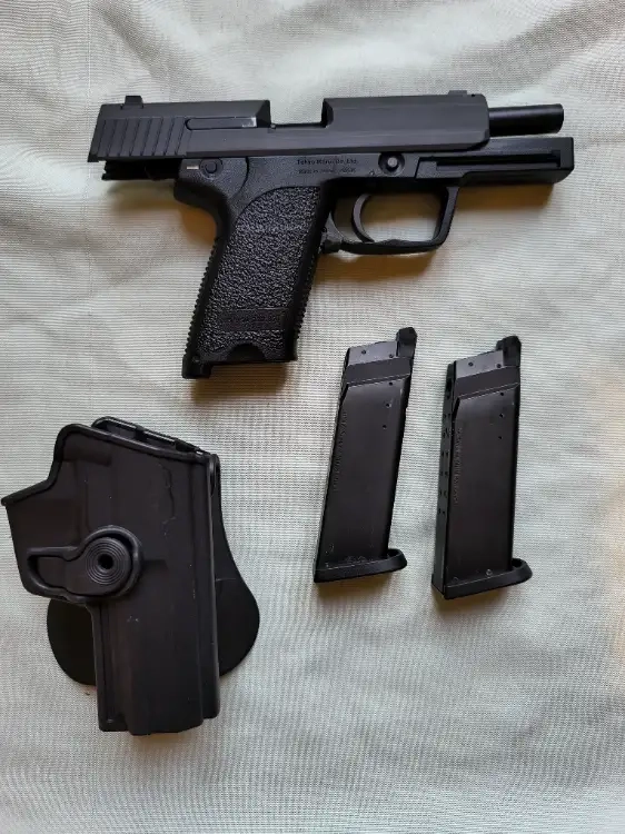 réplique poing Tokyo Marui USP GBB vendu avec deux chargeurs ( dont l'un présente fuite de gaz ), étui ceinture, boîte d'origine.