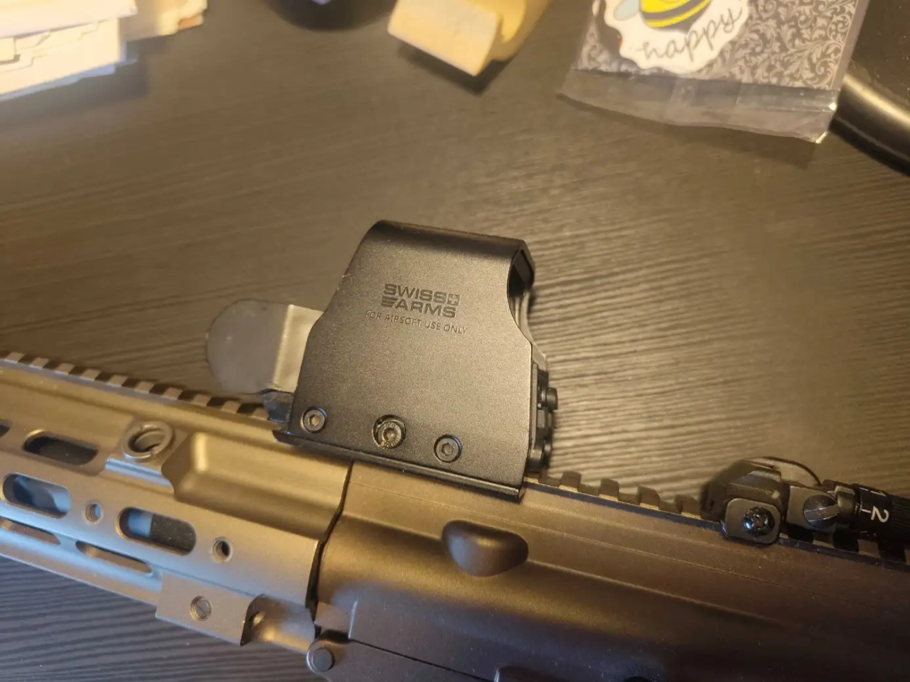 Optique holographique picatinny Swiss Arms (déjà montée sur la réplique, voir photos), réticule rouge ou vert a luminosité réglable d'une valeur de 80e également fournie avec.