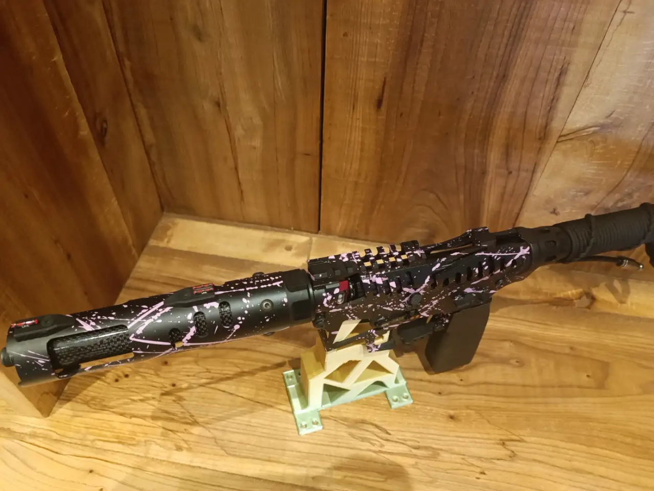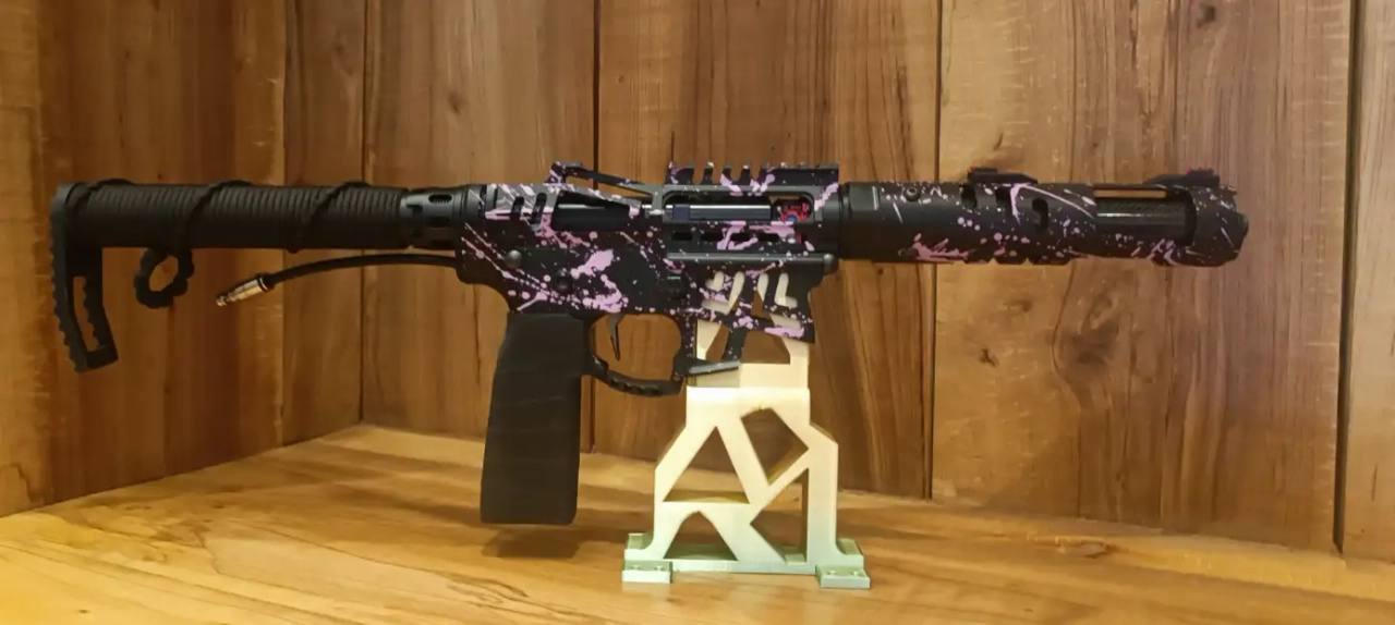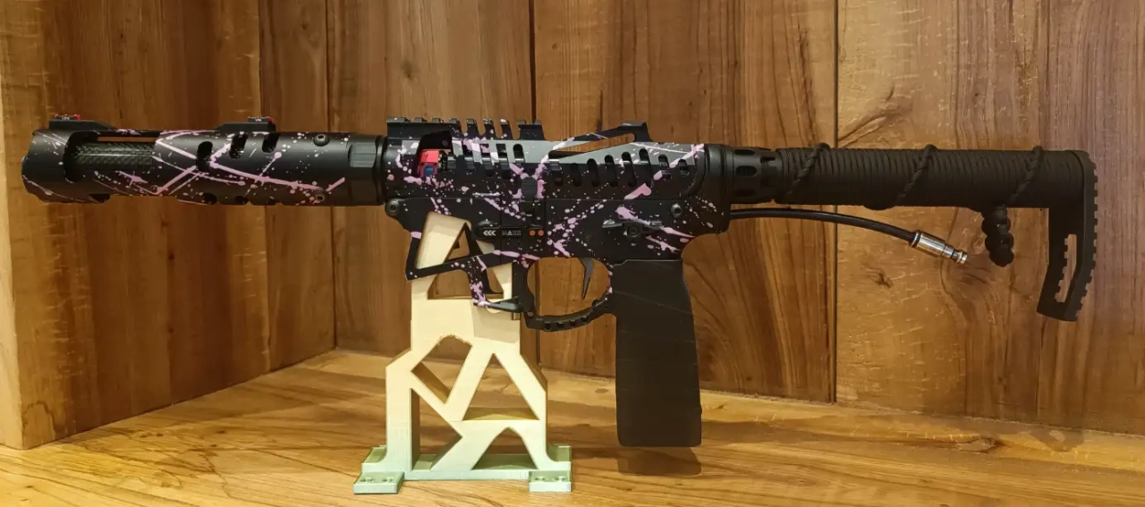Le tube de crosse est en fibre de carbone, recouvert par un tressage de Par'Art'Cord, la plate est en impression 3d , tout comme la poignée