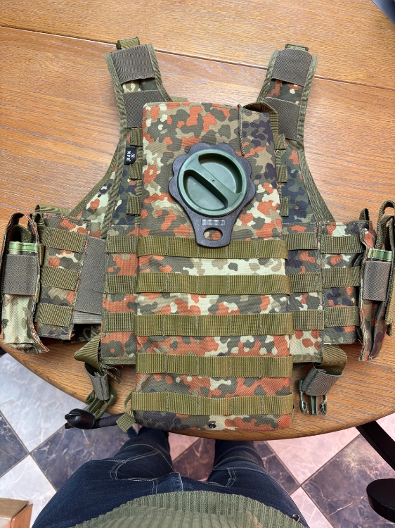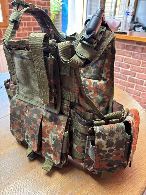 Je vends mon gilet flecktarn qui ne m’a pas servi plus d’une fois. C’est un gilet porte plaque molle, avec 5 portes chargeur type m4/416 et 3 porte chargeur type mp5.