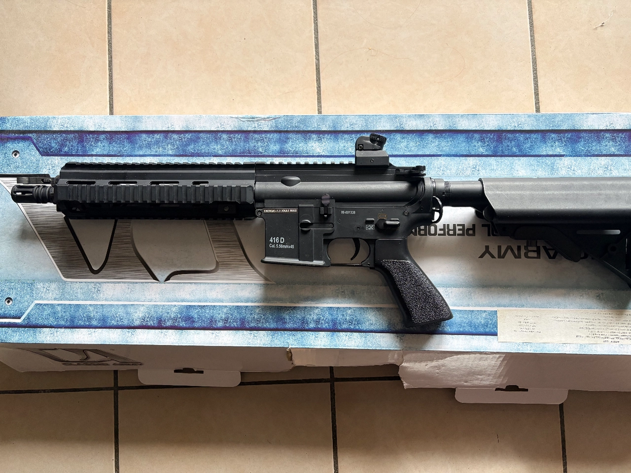 HK416D (CA416) AEG, une réplique d'airsoft fabriquée par Classic Army dans sa version CQB. Pourvu d'origine d'un mosfet, ainsi que d'une gearbox V2 QD (changement rapide de ressort) qui ravira un grand nombre d'airsofteur.