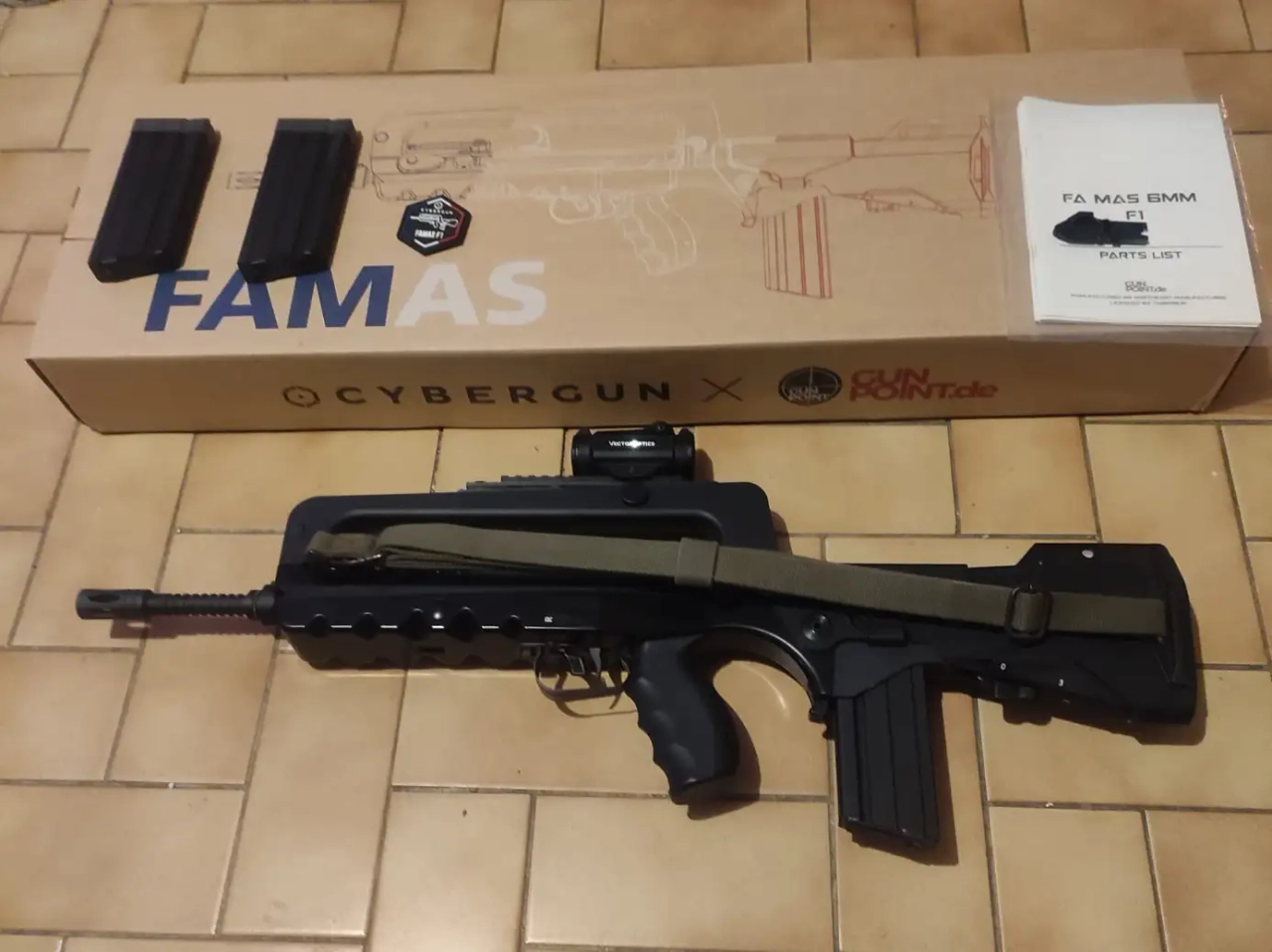Il est vendu avec 3 chargeurs (6 followers pour passer les chargeurs en 33 coups au lieu de 25), la boite d'origine, les manuels, le patch Famas, une sangle RS des années 90, un rail picatinny en impression 3d Carbone (atelier GBBR) retouché à la dremel pour être plus bas et moins flexible. il y a également une pièce en impression 3D pour retirer le jeux du garde mains.