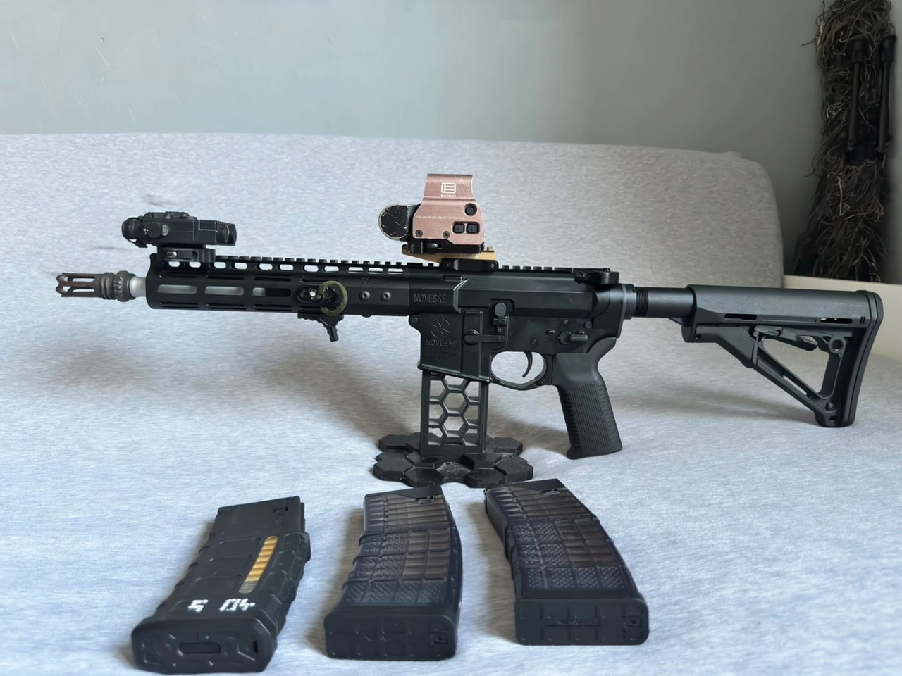 N4 novesque de chez double eagle copie mws donc interne compatible avec marui cross ctr mount unity holo repro eotech peq15 factice cache flamme avec silencieux stop hand en interne n-pass et pâte d’appuis upgrader deux chargeur trois chargeur inclus dont deux cyma et l’origine