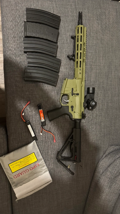 Avec 5 chargeurs donc celui d’origine et d’autres en métal, jamais modifié elle est d’origine, je la vends avec le viseur et deux batteries lipo + la pochette de protection des lipo. Je peux également vendre le chargeur à lipo en supplément.