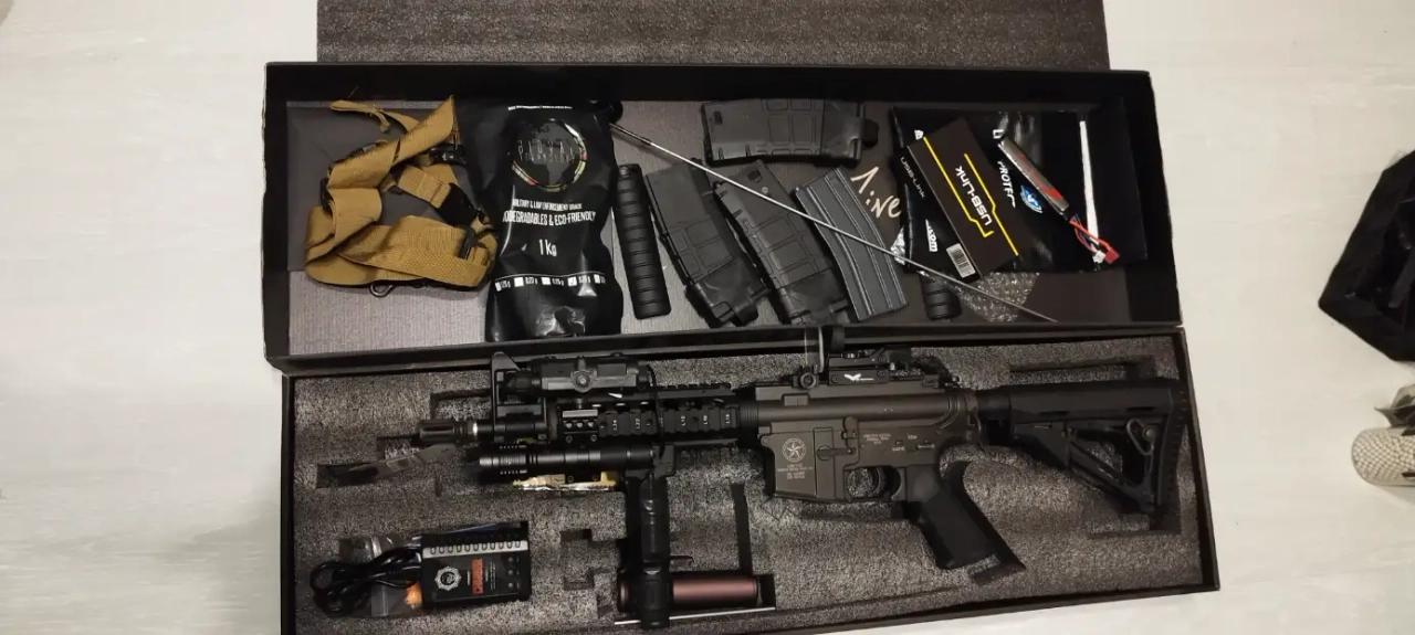 Elle est equipe comme sur la photos, avec an peq fam 15 (lampe +lasser rouge, un viseur reflexe, une lampe (amazon mais fonctionne tres bien), une poignee bipied, une sangle, 4 chargeur 130 bille avec tire chargeur, une batterie Lipo 11.1, un USB link pour regler le Titan ainsi qu'une sachet de bille en 0,25, vendu avec sa boite d'origine.