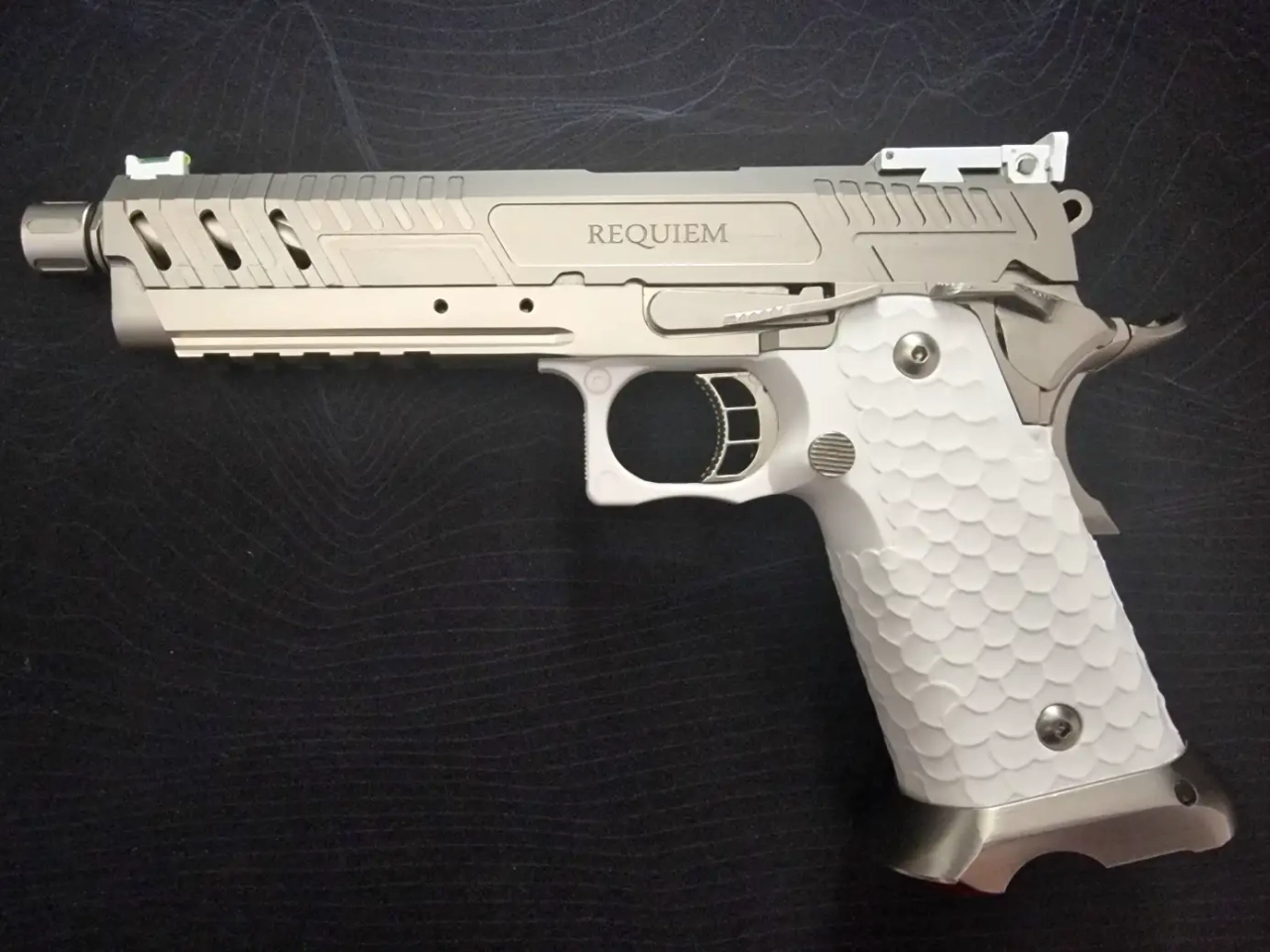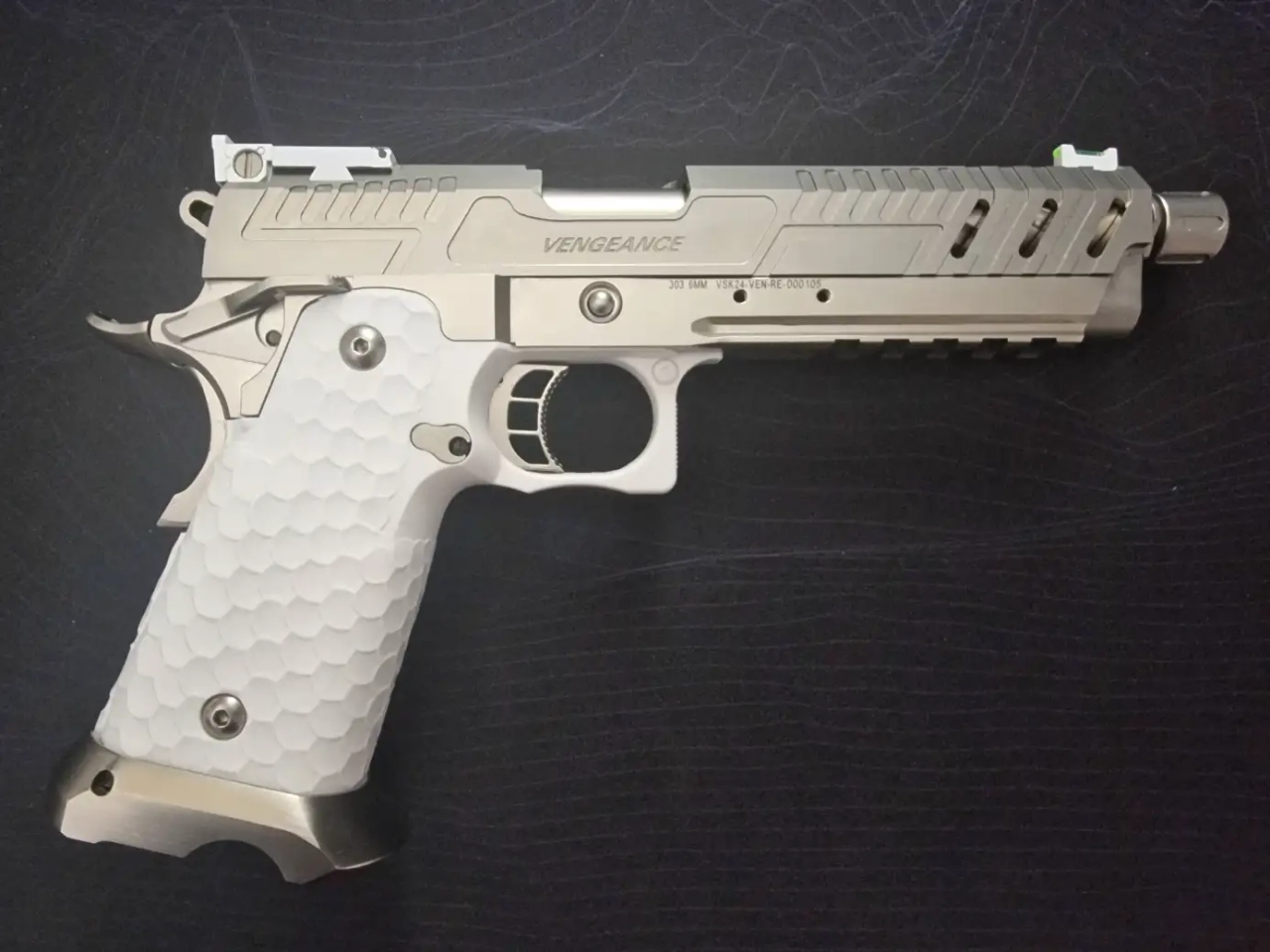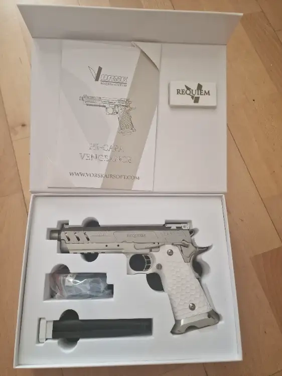 À vendre : réplique **VORSK Hi-Capa Vengeance Requiem**, état **neuf**, jamais utilisée, complète dans sa boîte d’origine.