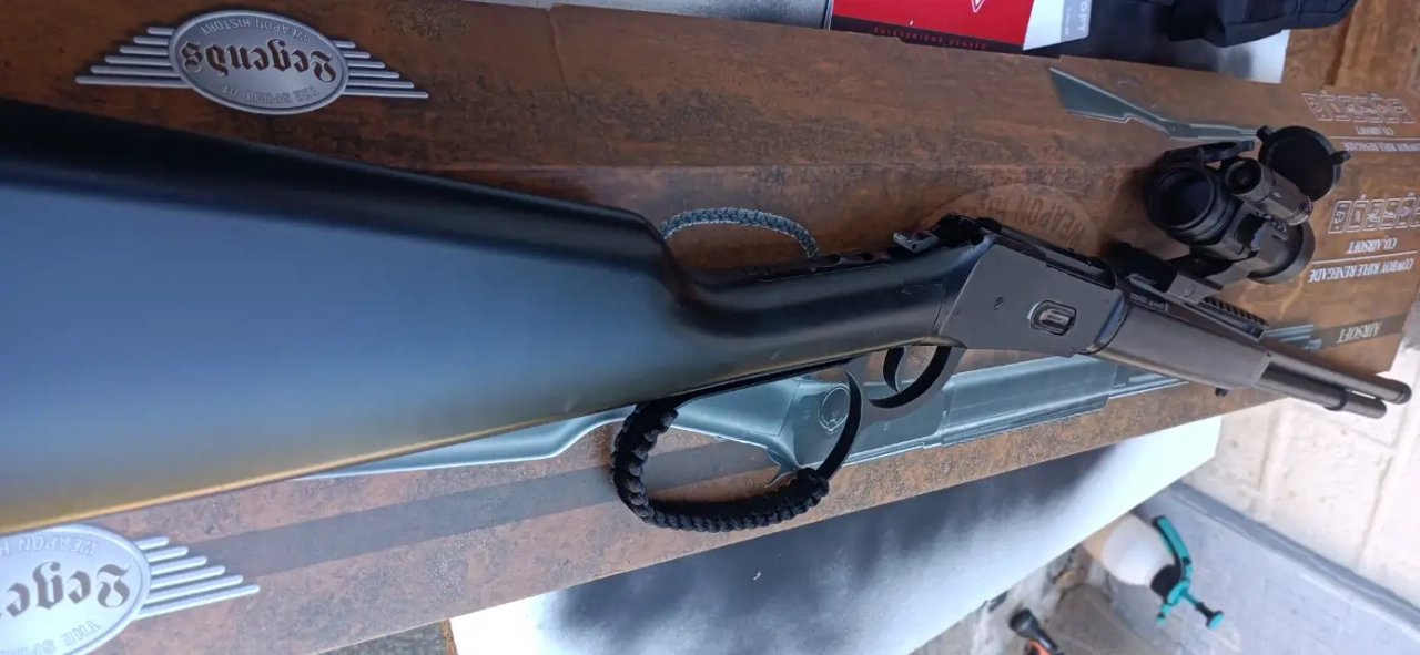 Fusil à répétition du far west dans sa version modernisé, rail picatinny & canon fileté 1/2' unf avec para-corde sur le levier d'armement agrandi