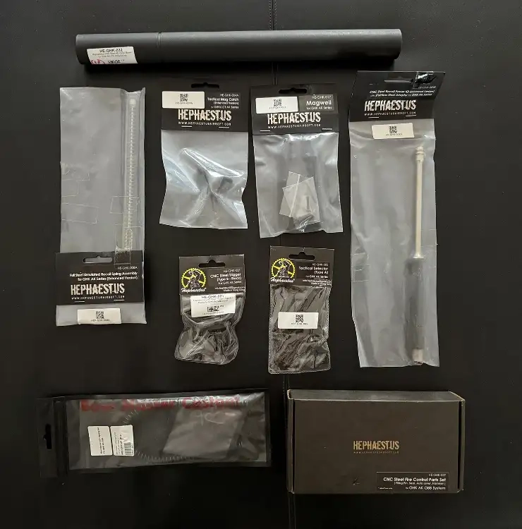 Je vends des pièces en acier HEPHAESTUS neuves et sous blister pour AK GHK, ainsi qu'un canon extérieur en acier (longueur AK 105).