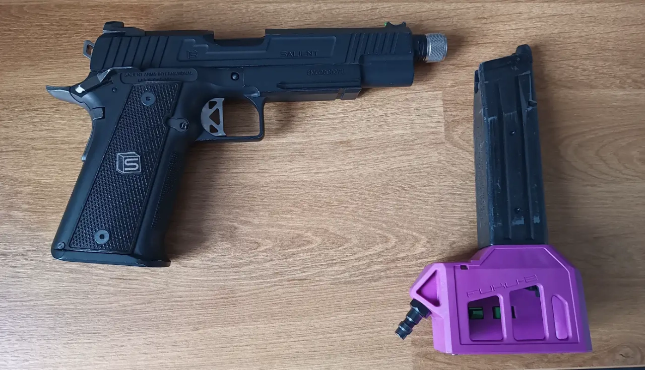 Il est fournis avec un kit HPA Ctm-tac, valve us, mauve monté sur un chargeur Tokyo Marui, le chargeur a des traces de frottements sur les cotés mais fonctionne parfaitement.