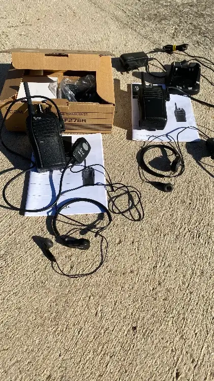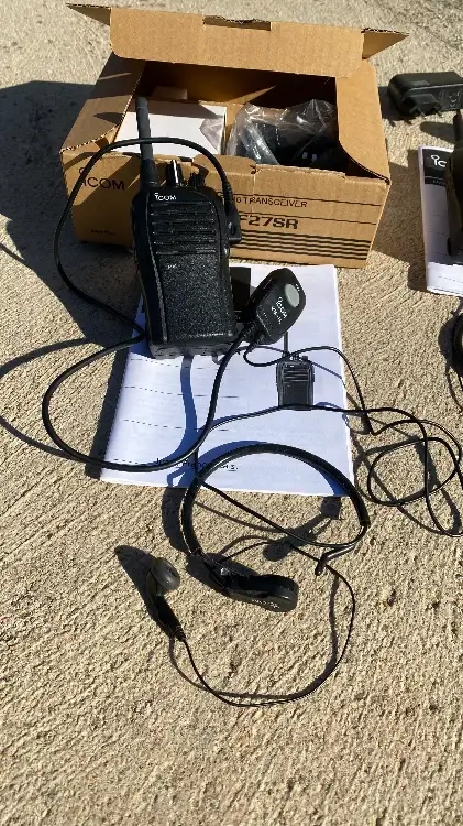 Ensemble radio PMR 446 constitué de 02 radios F27 SR ICOM + 2 push to talk VS-1L ICOM et de 02 micro laryngophones HS-97 ICOM. Le tout en excellent état, pret à servir.