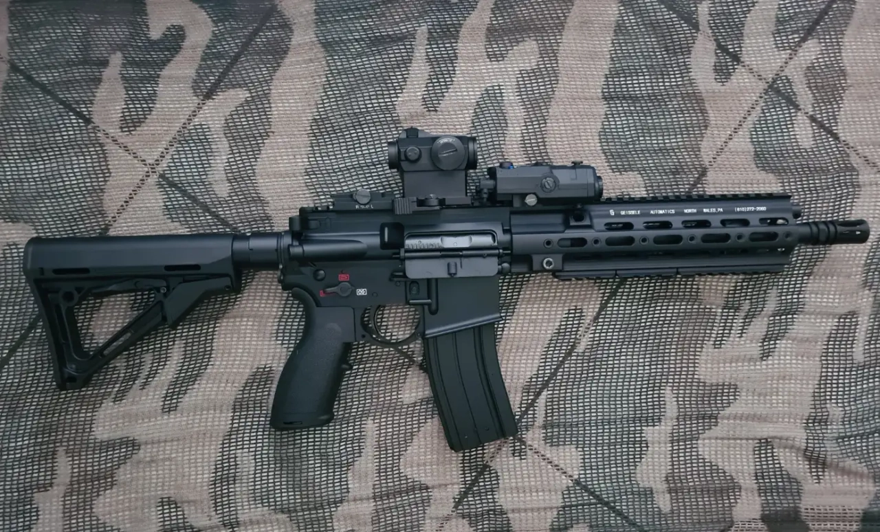 avec un viseur point rouge et un boiter an peq avec lampe et laser