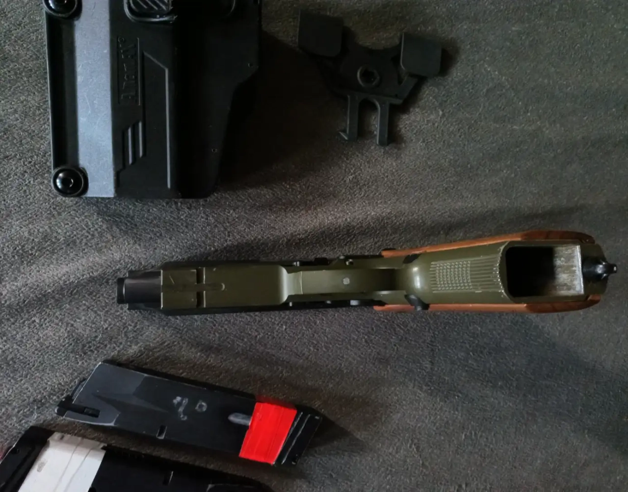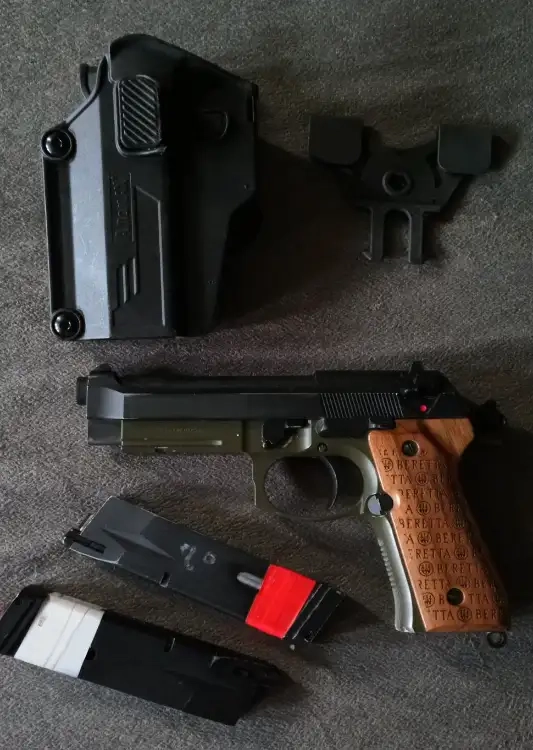 Vends m9 co2, plaquette beretta véritable. holster rapide ( ceinture et molle).deux chargeurs.