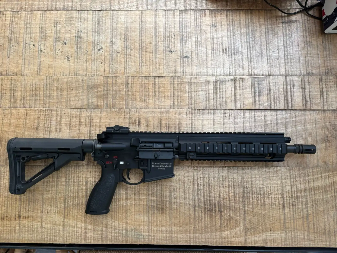 Livré avec un Elcan Specter avec zoom réglable en 1x/4x et sa DMR sur le dessus + ses organes de visée natif (pas visibles sur la photo) + grip de garde main + poignée avant + 2 ajouts latéraux picatinny.