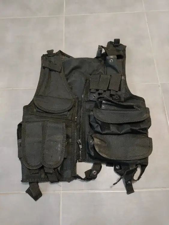 À cela s'ajoute : un gilet tactique Swiss Arms, un holster de ceinture Swiss Arms, un holster de cuisse (qui sera propre au moment de la vente), un ceinturon AdTF, une cagoule trois trous noire, une sangle 2 points, 1 paire de lunettes et un reste de flacon de billes)