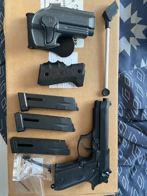 Vendu avec un holster et un grip supplémentaire (il ne s'emboite pas bien en place sur la réplique)
