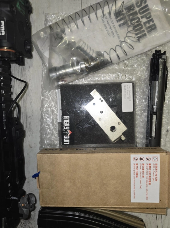 Interne bloc hop up complet ra-tech bloc détente ra-tech et la cullasse doré ra-tech et le nozzle alu ratech avec npas fournis avec 4 chargeur et 2 chargeur neuf jamais ouvert plusse plein de pièce fourni avec