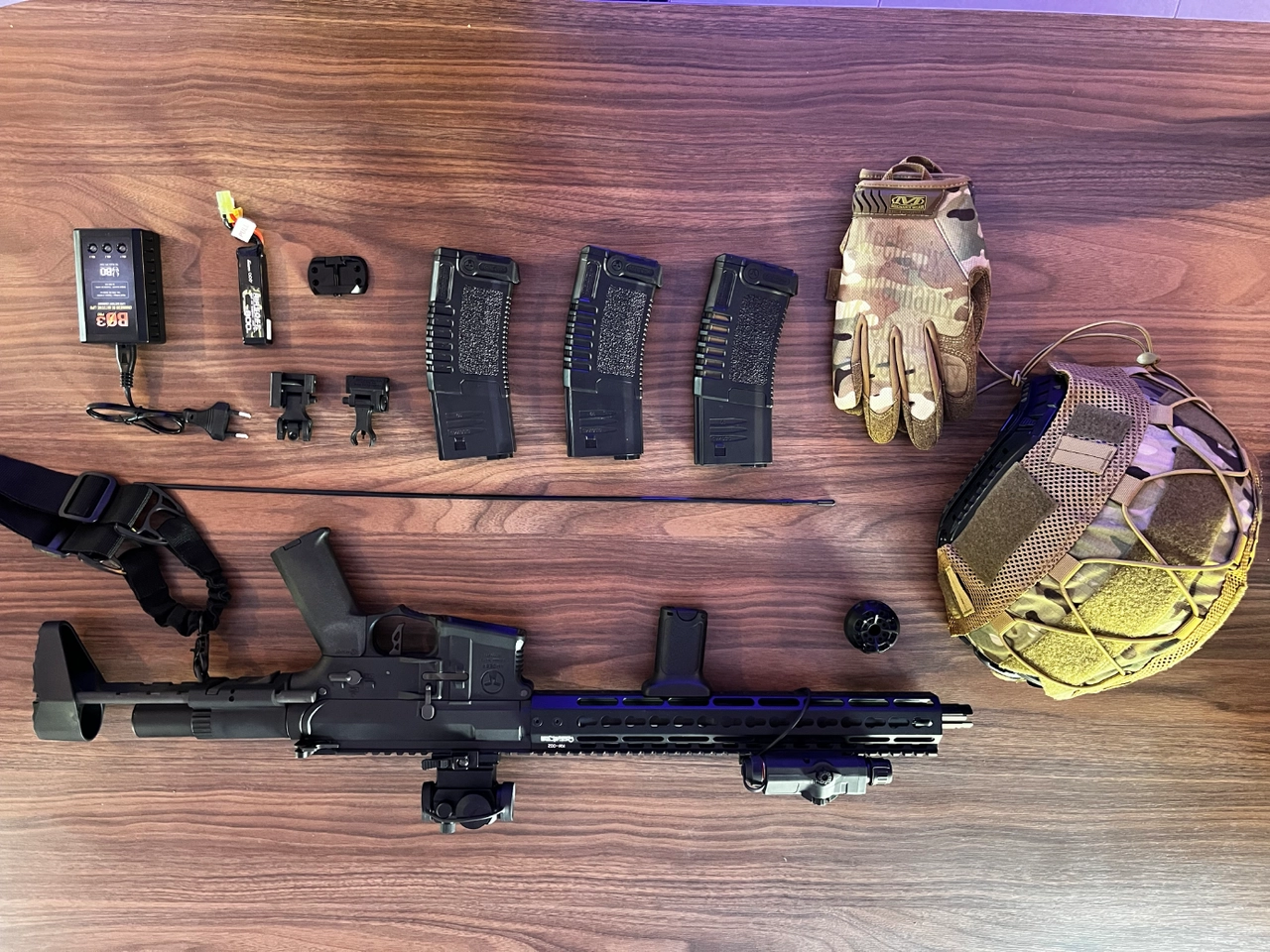 À vendre : réplique M4 AMOEBA AEG jamais servi accompagné de ses trois chargeurs, un frein de bouche, un Mpoint de la marque DUEL CODE, une lampe avec déport de la marque WADSN, un chargeur de batterie et une lipo neuve.