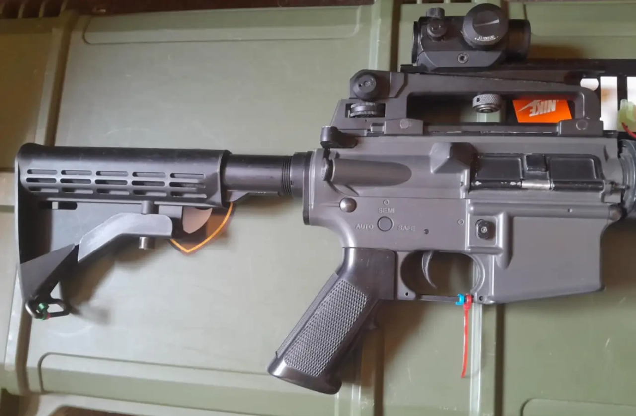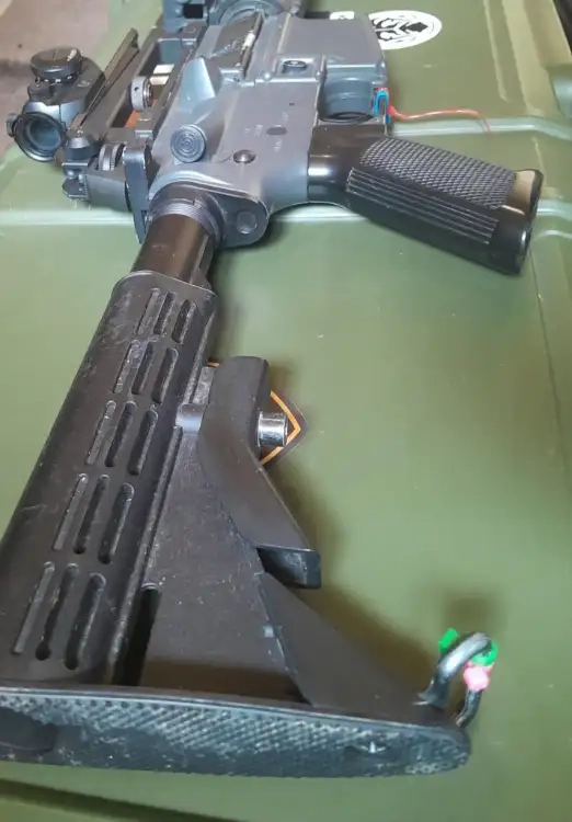 vend M4 marque chinoise, n'est pas sortie depuit 2022, equipé d'une poigné de transport avec point vert monté dessus, un silencieux pour le custom et boitier au dessus du canon qui acceuil la batterie, aucun chargeur de dispo