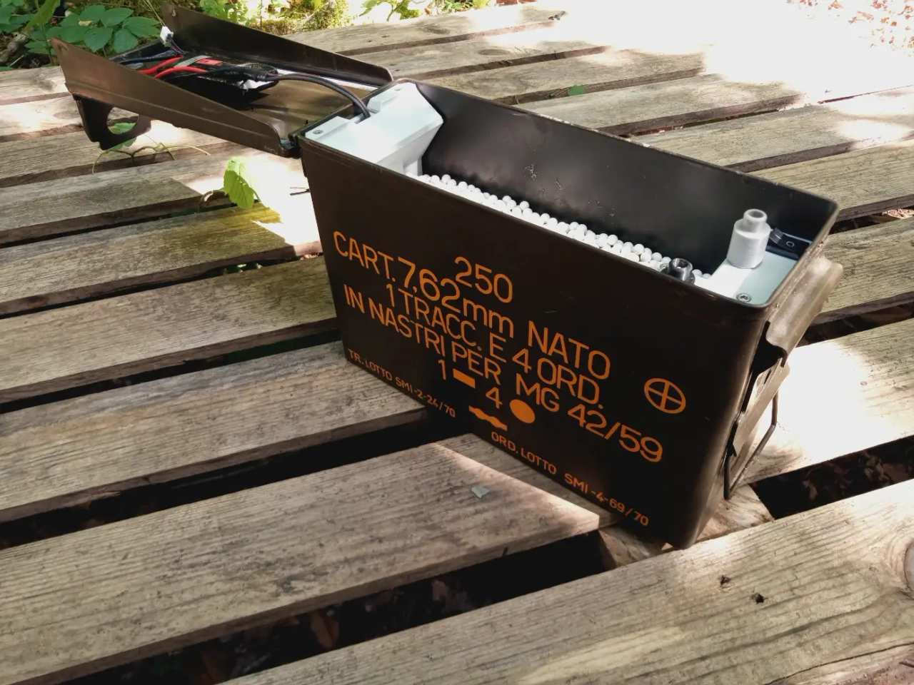 Fonctionne avec tout type de batterie et voltage, vous pouvez choisir la connectique entre Dean et Tamiya, le système est installé dans une caisse de munitions métallique étanche pour garder les billes au sec