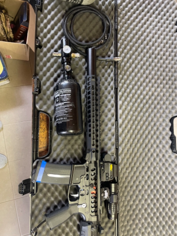 Pack complet hpa wolverine inferno gen 2 + bouteille + régulateur + flexible + batterie veleur neuve 550 euros. + bouteille Carbon kevlar 220 euros