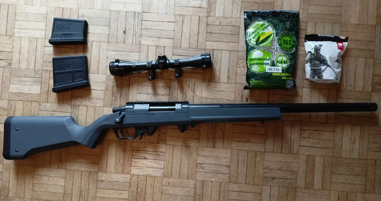 Un chargeur qui ne fonctionne mal (possible de l'utiliser), Un paquet de billes 0.40g, Un paquet de billes 0.32g bio, La lunette de visée (très bon état)