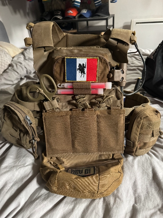 deux poché latérale, une poche pectorale, poche ventrale est une en dessous, une minimap dans le dos, un ptt, est un talkie-walkie Motorola.