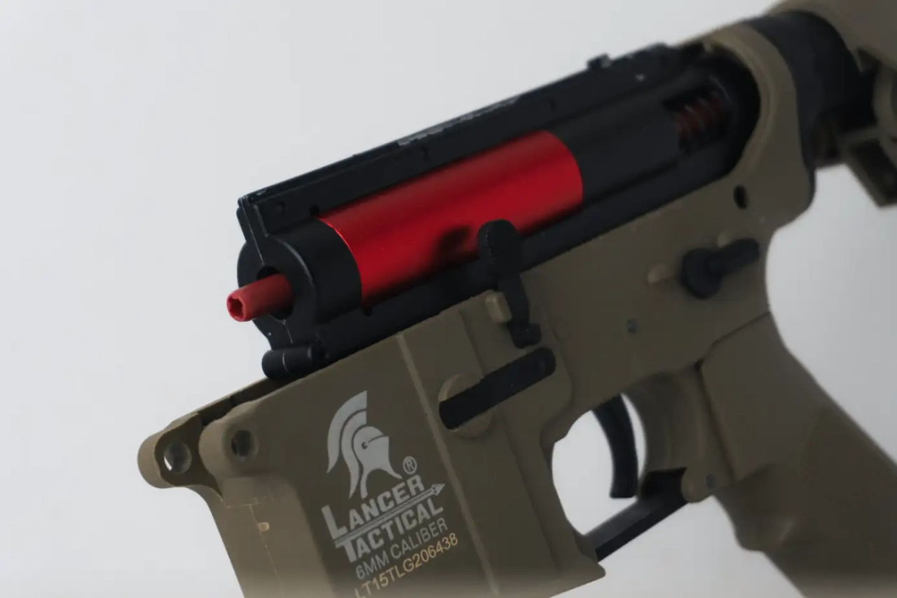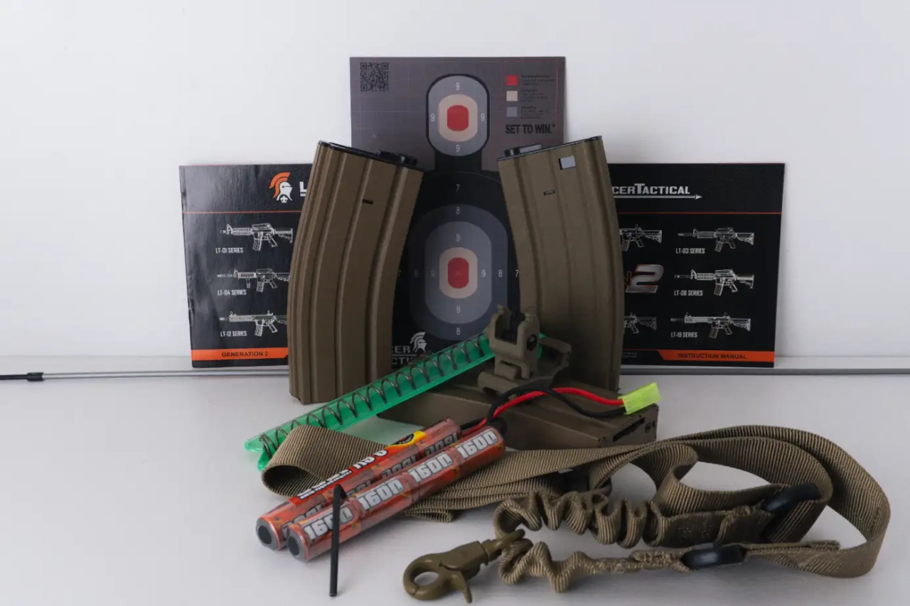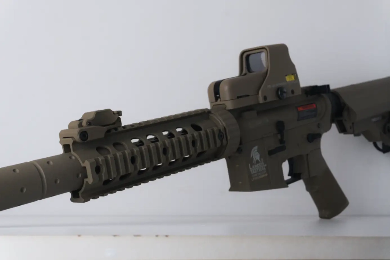 Je vends ma réplique de M4 tan de chez Lancer Tactical génération 2 avec sa boîte d’origine, un chargeur de batterie classique, une batterie NiMh 9,6V, un viseur holographique AIM-O de qualité, une sangle, 3 chargeurs tan, des cibles, un ressort M90 et une tige de débourrage.