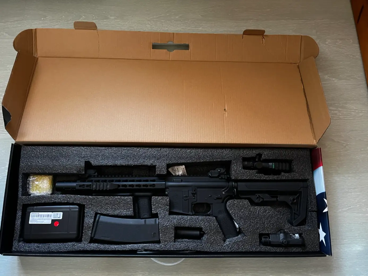Vendue avec nombreux accessoires (lampe, poignée, chargeurs supplémentaires, lunette point rouge...)