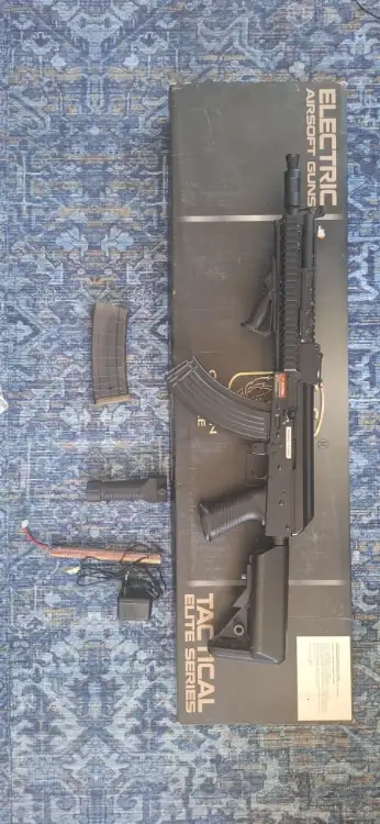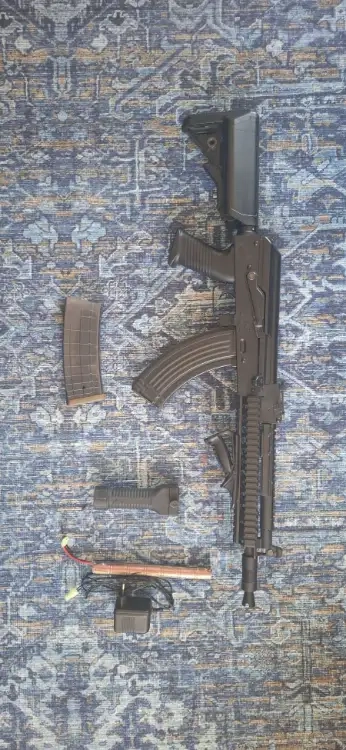 Bonjour je vend ma réplique d'ak-m de chez golden eagle avec 2 chargeur (celui d'origine de 300 coup et un mid cap de 120) et les 2 poignées sur l'image