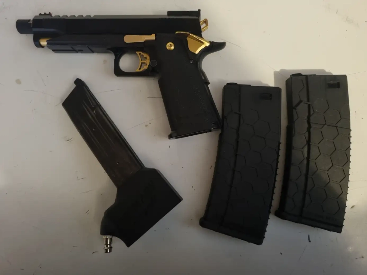 vend hi capa 5.1 gold match tokyo marui , trés bon etat , vendu avec 1 chargeur gaz , un adaptateur primary airsoft hpa et 2 chargeur m4