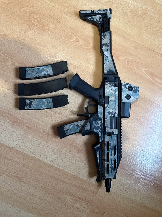 La réplique fait 1,3j à la 0,25g kit déco airsoft skin zone vendue avec le viseur holo, adaptateur pour silencieux et 4 chargeurs mid cap plus 1 chargeur hi cap et sa valise,coupleurs de chargeur et kit atek prise en mains