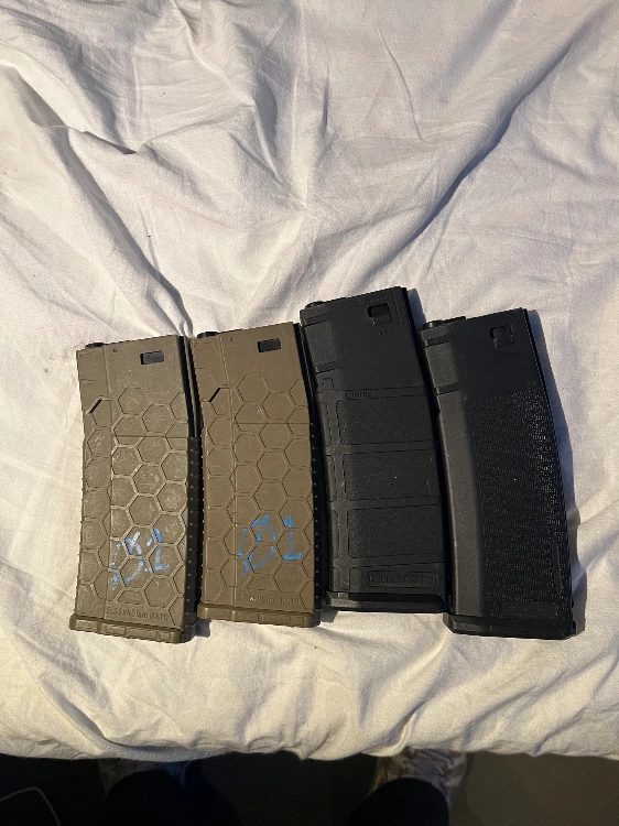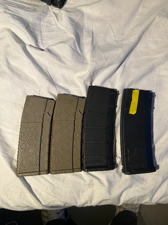 Bonjour je vend 4 chargeur m4 polymère en bon état sauf celui avec le scotch jaune qui est un peu cassé mais fonctionne