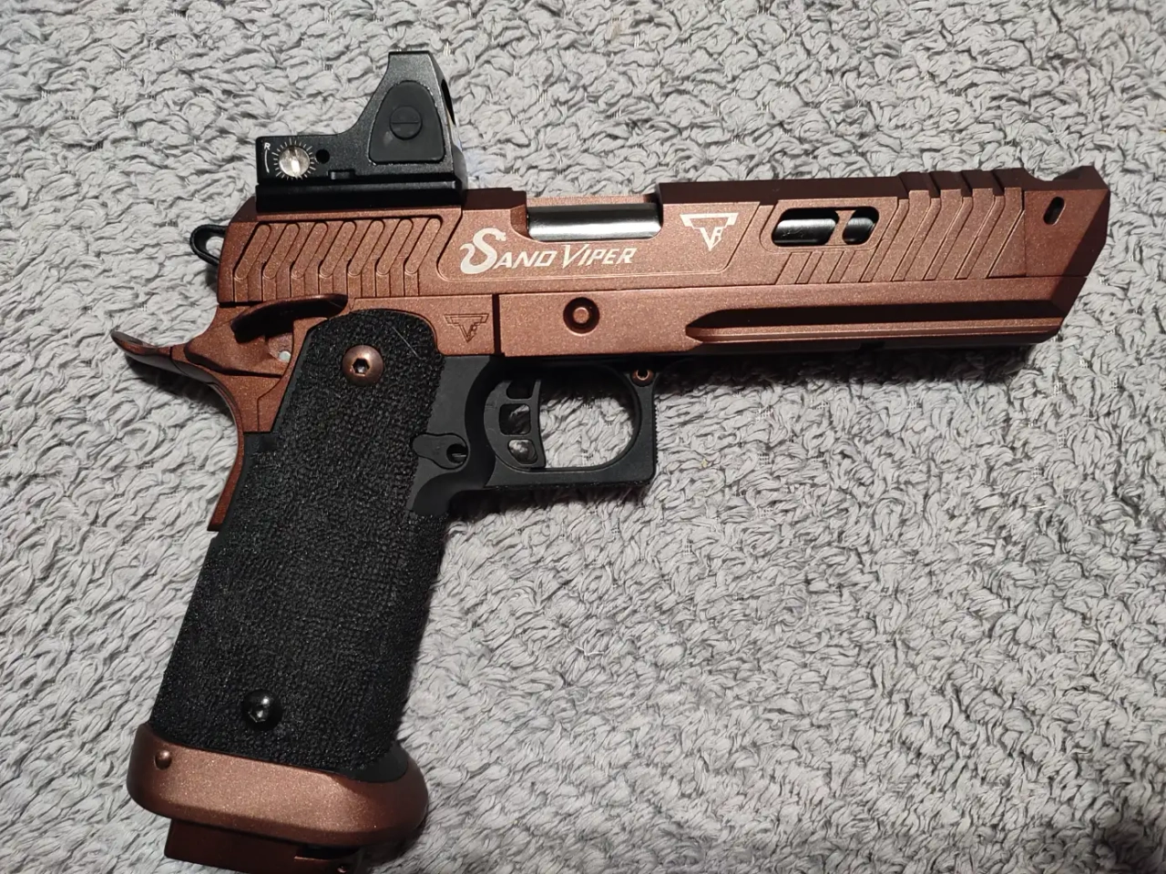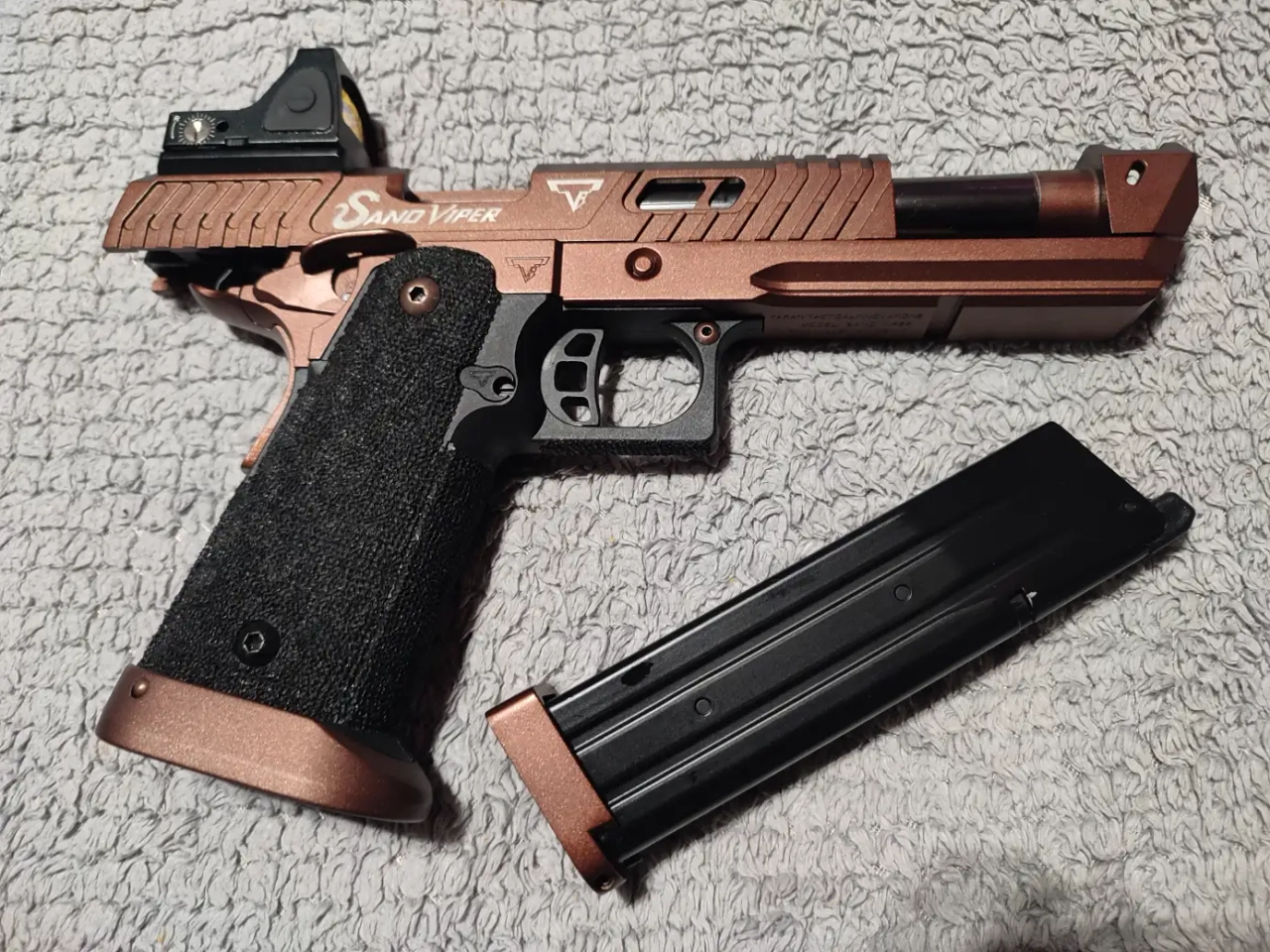 Je mets en vente mon sand viper acheter ya bien 2 ans facile. La première version R-615 de chez Army Armament, avec les inscriptions taran tactical innovation, sorti pour le film john wick 4. Je l'ai acheté pour son look à avoir dans ma collection, mais clairement il n'a jamais bougé de l'étagère ! Pas une seule game, donc pas de trace d'usure de holster ! Il a dû tirer 3 chargeurs max, donc il est pour ainsi dire, neuf!