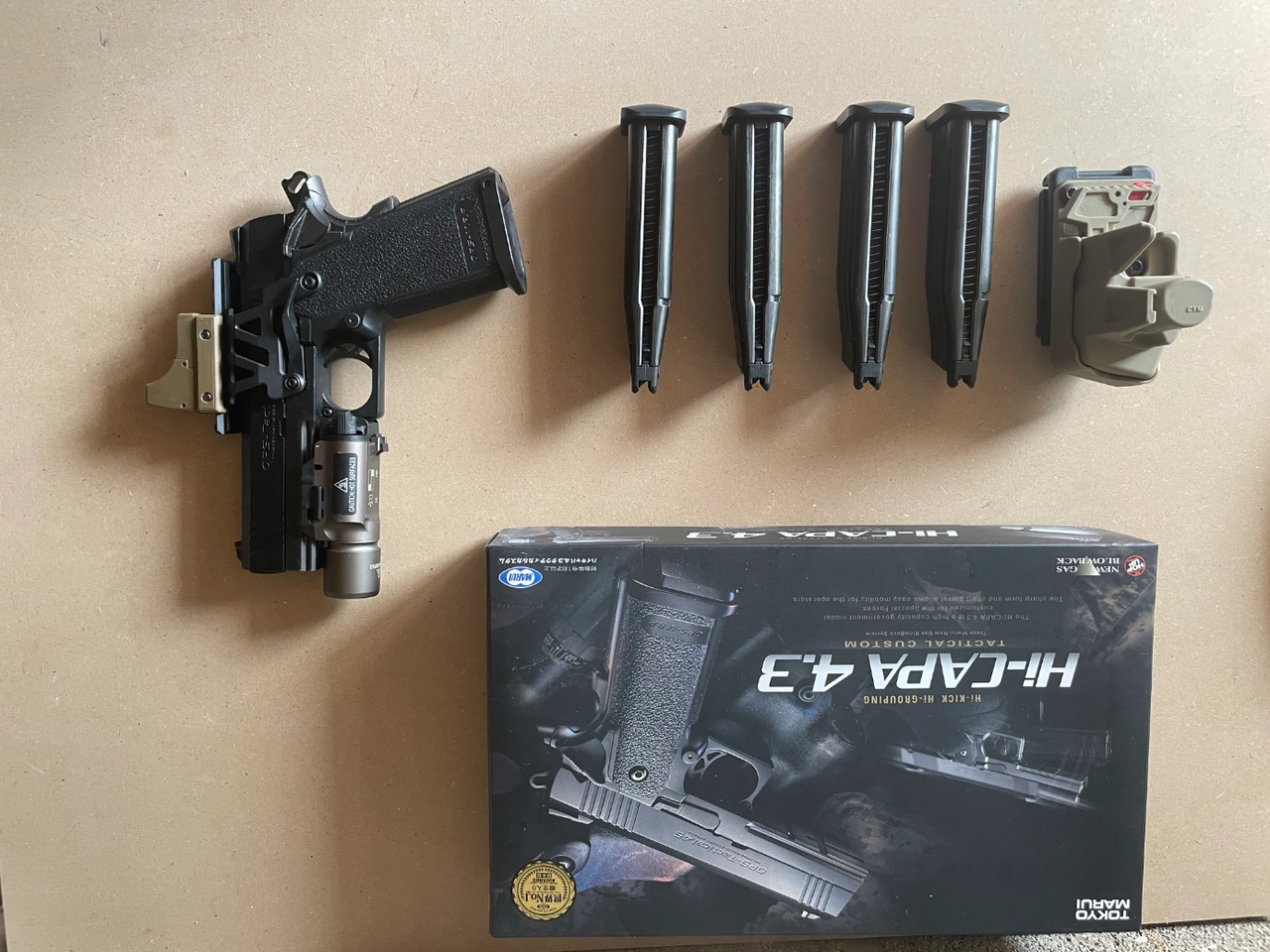 Vend hi-capa tokyo Marui 4.3 du 27 septembre 2024 non upgrade, avec 4 chargeurs, dont un qui fuit à vérifier, le holster et le rail pour rmr. !!!!!!!Attention le rmr et la lampe ne sont pas à vendre c’est juste pour la photo!!!!!!!