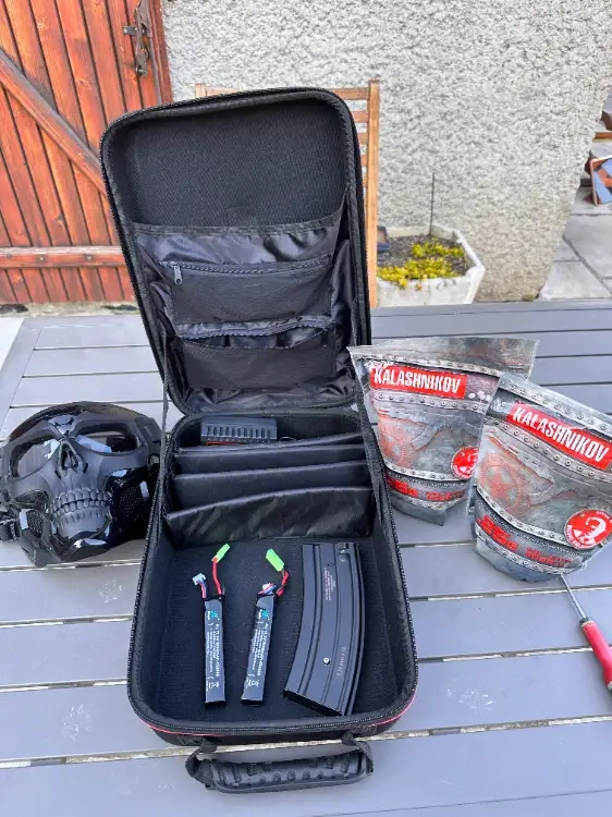 une pochette de transport permettant de déplacer uniquement les accessoires (billes, masque, batteries, chargeur, etc.),