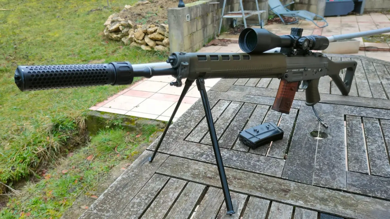 Réplique de marque G&G, modèle SG550. Le canon est équipé d'un filetage CCW de 14 mm avec silencieux (intérieur tube mitraillette + mousse). Crosse repliable, bipied intégré, corps en métal, très robuste.
