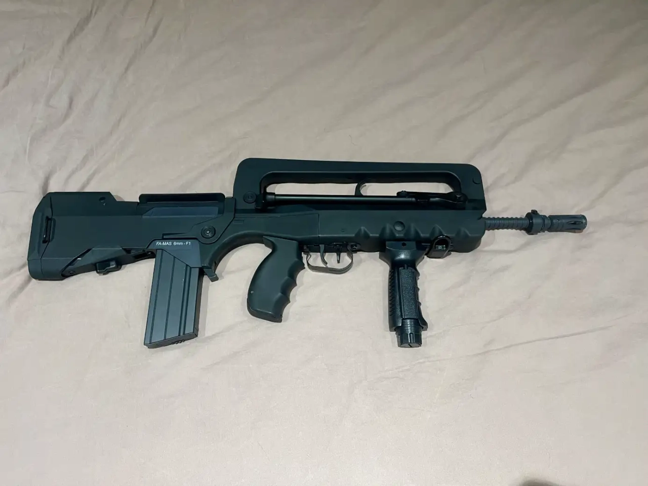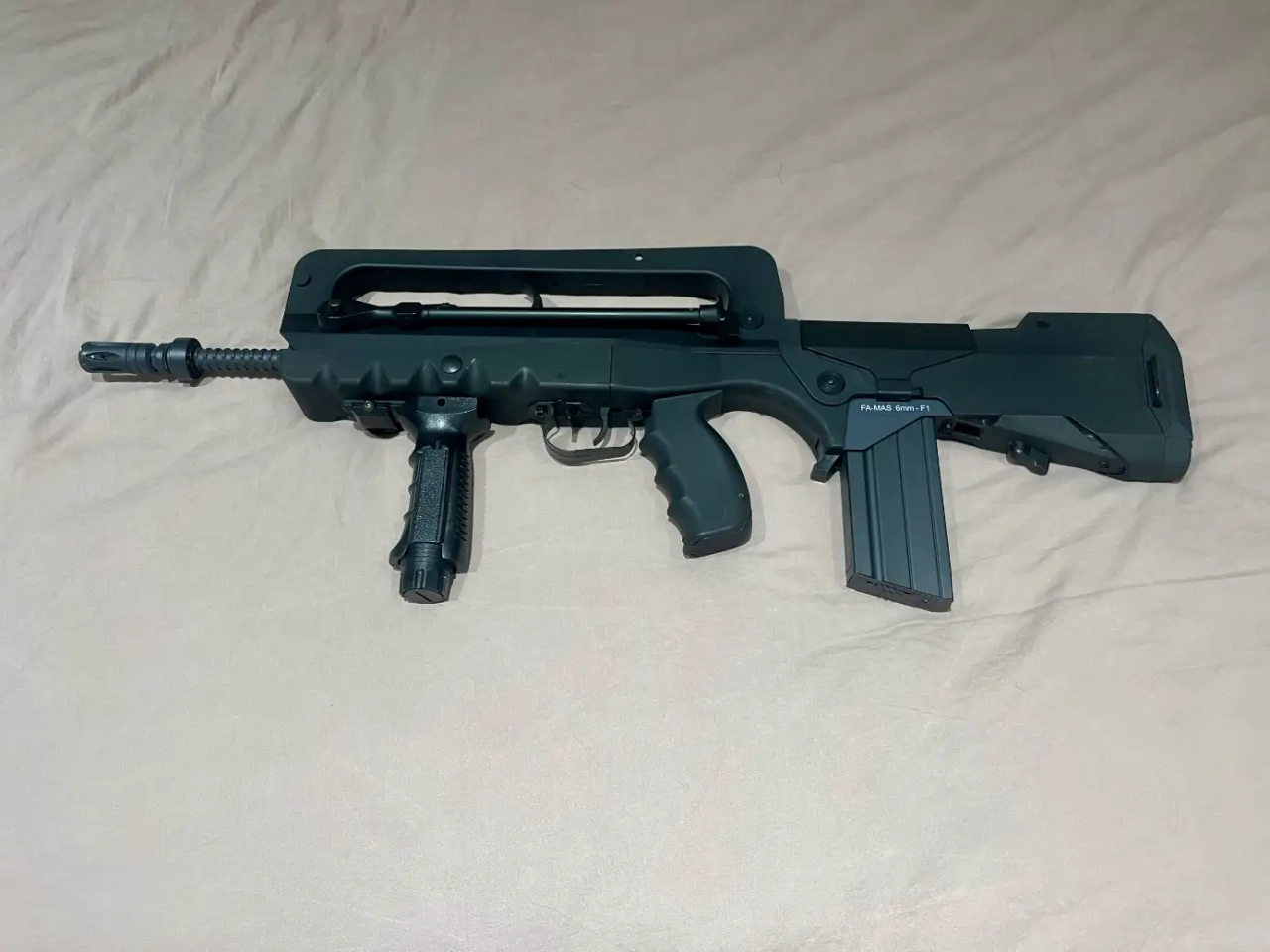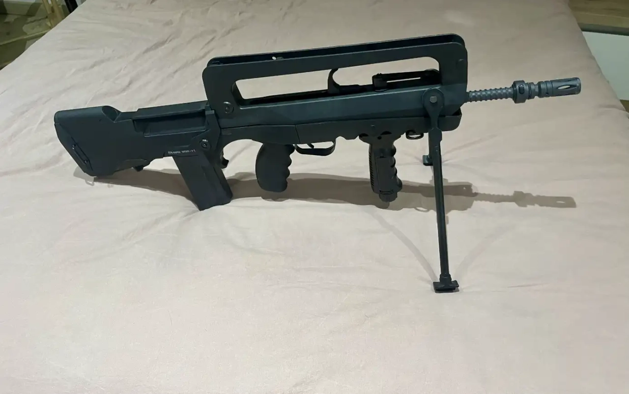 Fusil d’airsoft FAMAS F1 Cybergun en excellent état, version Nylon Fibre & métal, propulsion AEG. Puissance de 1,3 J (environ 374 FPS à la bille de 0,20 g) avec hop-up ajustable. Mode de tir semi et full automatique, chargeur Hi-Cap 300 billes inclus. Livré avec batterie 8,4 V 1100 mAh et chargeur. Réplique légère (2,85 kg) avec bipied intégré et finitions fidèles au modèle original.