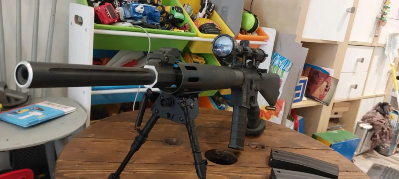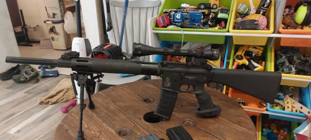 Bonjours, monté sur une base de M4A1 Long keymod cybergun (dont le garde main et le canon externe et fournis)