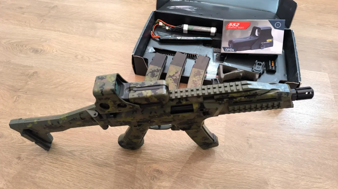 Un peu modifiée avec un connecteur T DEAN (fait chez Aerographe Airsoft Custom à Saintes), ainsi qu'un ressort moins puissant que celui d'origine pour baisser les FPS. Et esthétiquement avec une peinture par hydrographie sur la réplique, les 4 chargeurs et le viseur "EOTECH" (faite par une boutique d'airsoft du Sud-Est dont j'ai oublié le nom).