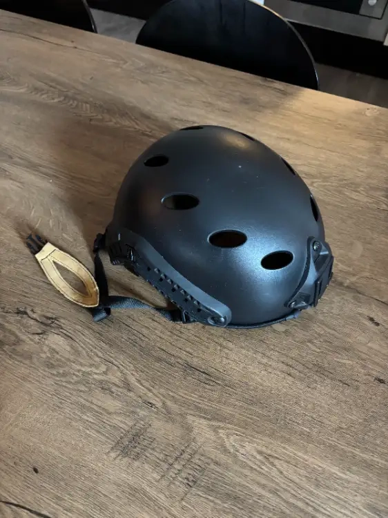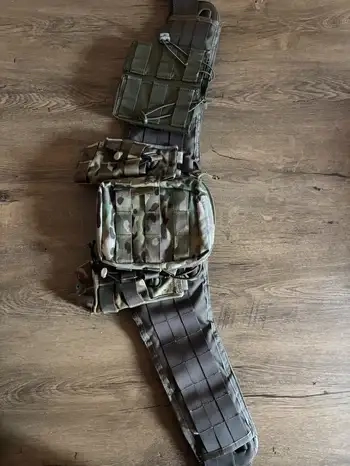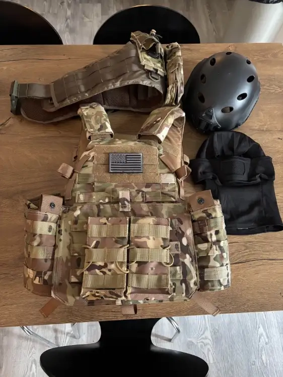 Porte-plaques, ceinture d'assaut, casque et cagoule avec protection buccale.