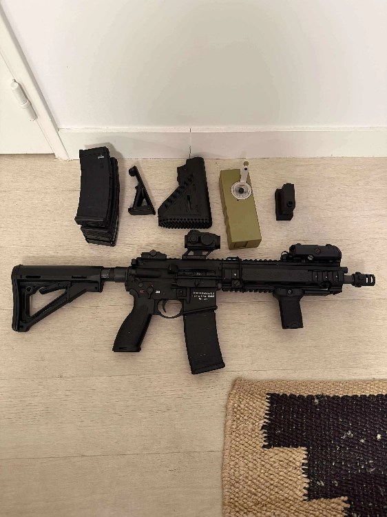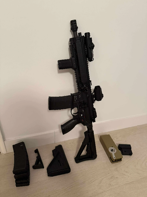 Je la vends avec 5 chargeurs, deux crosses, un viseur type aimpoint t2 (vector optics maverick) deux poignées avant et un speed loader avec un embout, imprimé en 3D conçu exprès pour les chargeurs GBBR + boitier laser lampe et couvre rails
