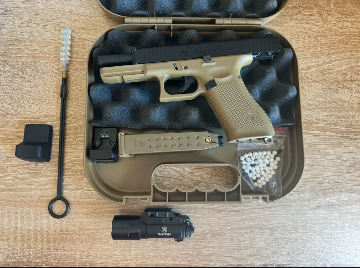 glock 17 gen 5 psa umarex fourni avec la malette glock, une lampe x300 600 lumens, une réplique fonctionnelle trjicon rmr ainsi qu’un kit de nettoyage fourni d’origine avec la réplique.
