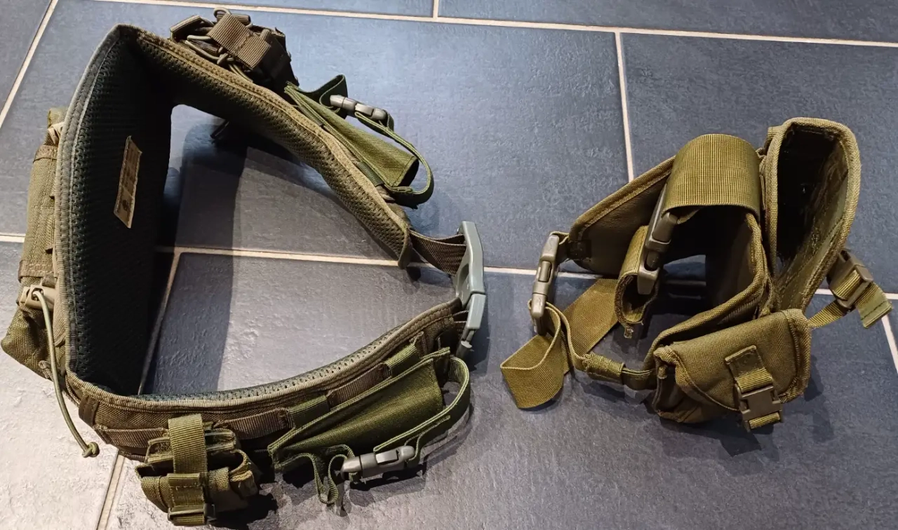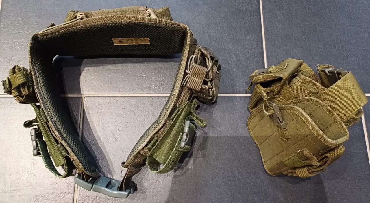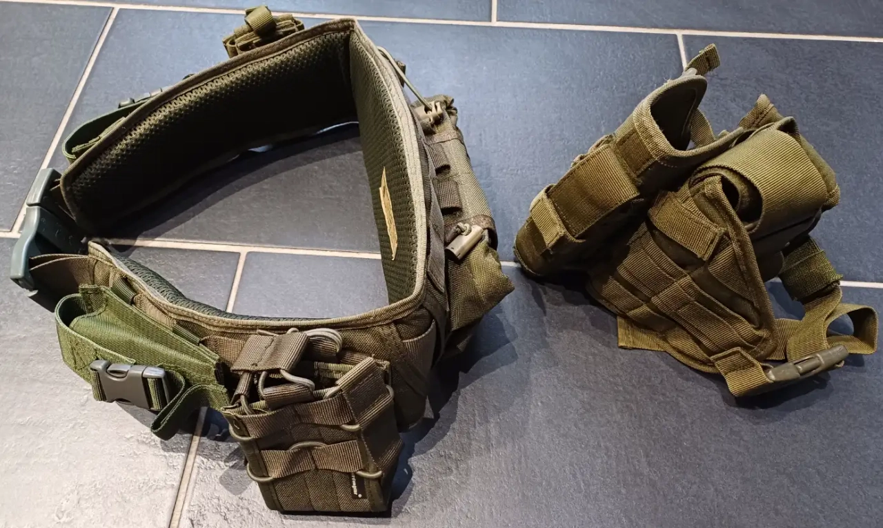 Bonjour, je met en vente ma Ceinture tactique olive Emersongear tout équipé avec ces différentes poches + holster de cuisse olive