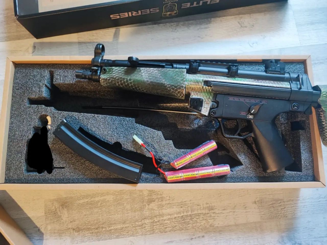 Je vends mon mp5 de golden eagle avec un camouflage fait maison, avec ça boîte d'origine. Idéal pour débuter. Je sais que la réplique fesait 1,4 joules.