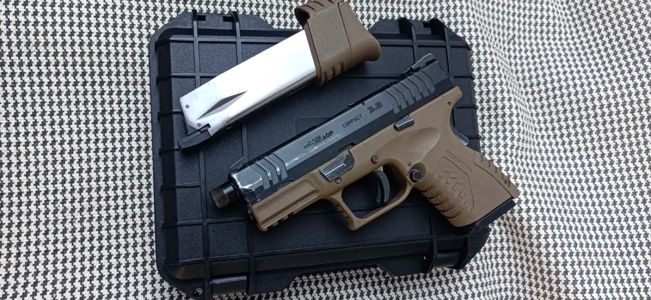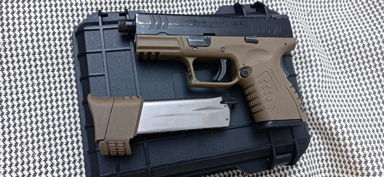 Fournis avec son chargeur d'origine [+ un talon alongé tan] et un deuxième chargeur H.S (valve de chargement en gaz manquante et poussoir à billes fonctionnelle mais la tirette pour y insérer des billes est cassé, nécessitant beaucoup de force pour pouvoir le tiré vers le bas ; +/- 8€ de pièces pour le remettre en marches)